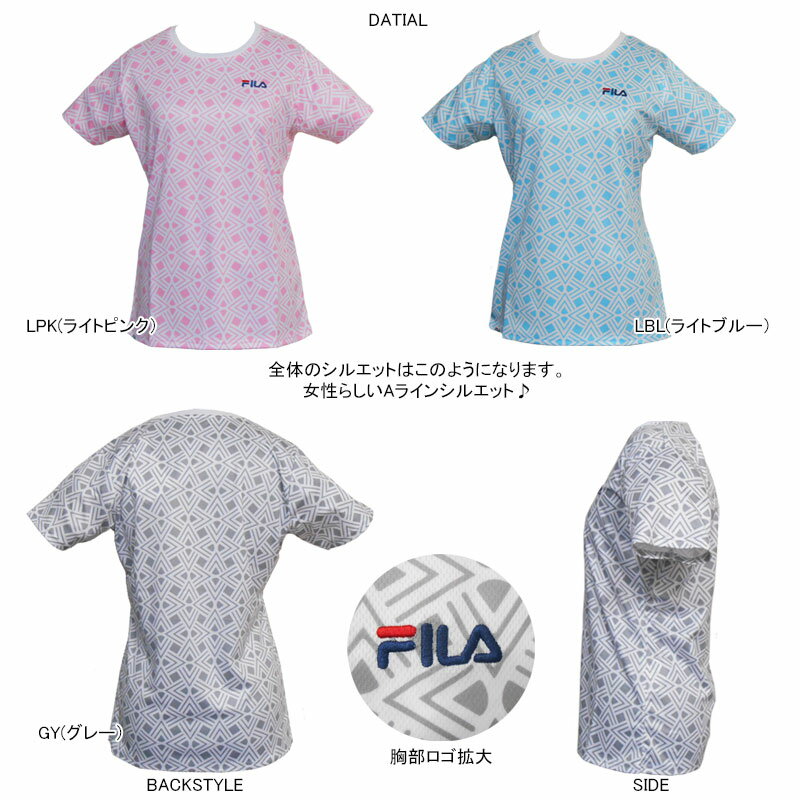 品名 FILA フィラ スポーツ トレーニング フィットネス 女性用 レディース Tシャツ 品番 417-905 特徴 ◆女性らしいAラインシルエット ※吸水速乾 ※UVカット機能付き ※ランニング・トレーニング時に最適!軽い運転や普段着にもオススメ♪
